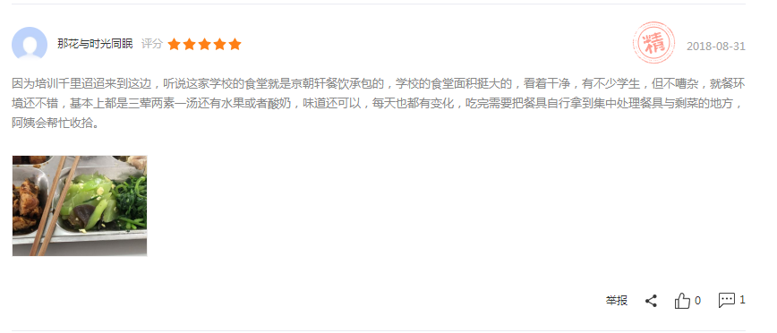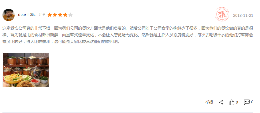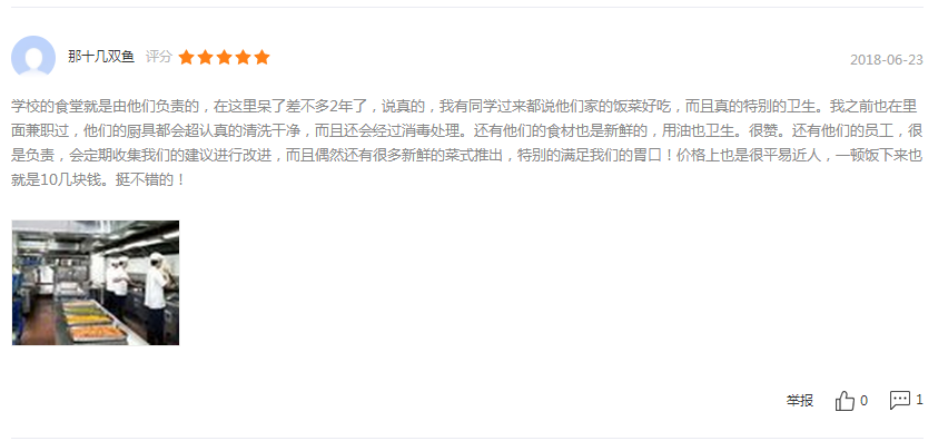 ? ? ? ?北京京朝軒餐飲管理有限公司在食堂承包運(yùn)營方面正在走向高質(zhì)量發(fā)展!不僅在菜品口味方面嚴(yán)格把關(guān),而且在食品安全方面更加重視。以下截屏是客戶的真實(shí)評價(jià):